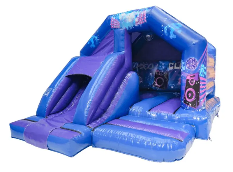 Disco castle with slide combi. The slide combo disco themed castle is double the fun as you can slide and bounce. So if it's the slide you love or the bouncing its the best either way you're going to have so much fun when hiring this castle. This inflatable is great fun and suitable for children of all ages